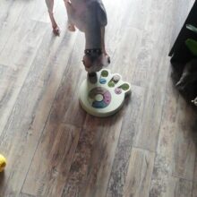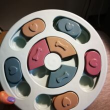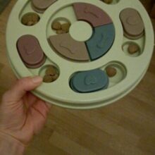My Border Collie, Grace, just loves this "toy." Dogs like Grace need constant mental, physical, and emotional stimulation and this thing helps for a few minutes in the evening. She has learned to check index every one, looking for a treat. When she finds one, she not only gets a treat, but she gets our praise. She has learned to use both her nose and her paw to manipulate the rounds. It is well built and heavy enough that it stays in place when Grace is playing with it. Because she still chews everything, after a few games, we take it up off the floor. Wonderful toy and I'm highly recommending.