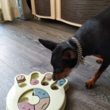 I love my dog more than life itself. He’s a rescue so not sure of his age. We think 15 (going on 3). Bought this puzzle hoping he would have fun and use it. Had no clue how fast he took to it. He’s not the most ‘intelligent’ so I wondered but he got the treats so fast. He hasn’t used his paws yet to move the pieces around, just uses his nose, but he’s doing it. Everytime he gets one I cheer for him and his tail wags like crazy and he continues on. He love his puzzle. I can’t wait to get him more so that he will get that brain going when I’m at work during the day (even though he’d probably play with it before I am even out of the driveway)