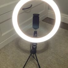This is the perfect little light ring! My others are too big for counter top filming like for face washing videos. I mounted this one to the mirror in my spare bathroom using command strips. That way I can take it on and off as needed. It’s big enough for my phone to fit in the center and bright enough for what I need it to do! Great price!